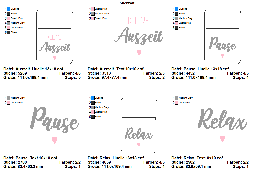 Folgende Stickformate werden in der ZIP-Datei angeboten: PEC - PES - XXX - JEF - JEF+ - SEW - EXP - VIP - VP3 - DST - HUS.