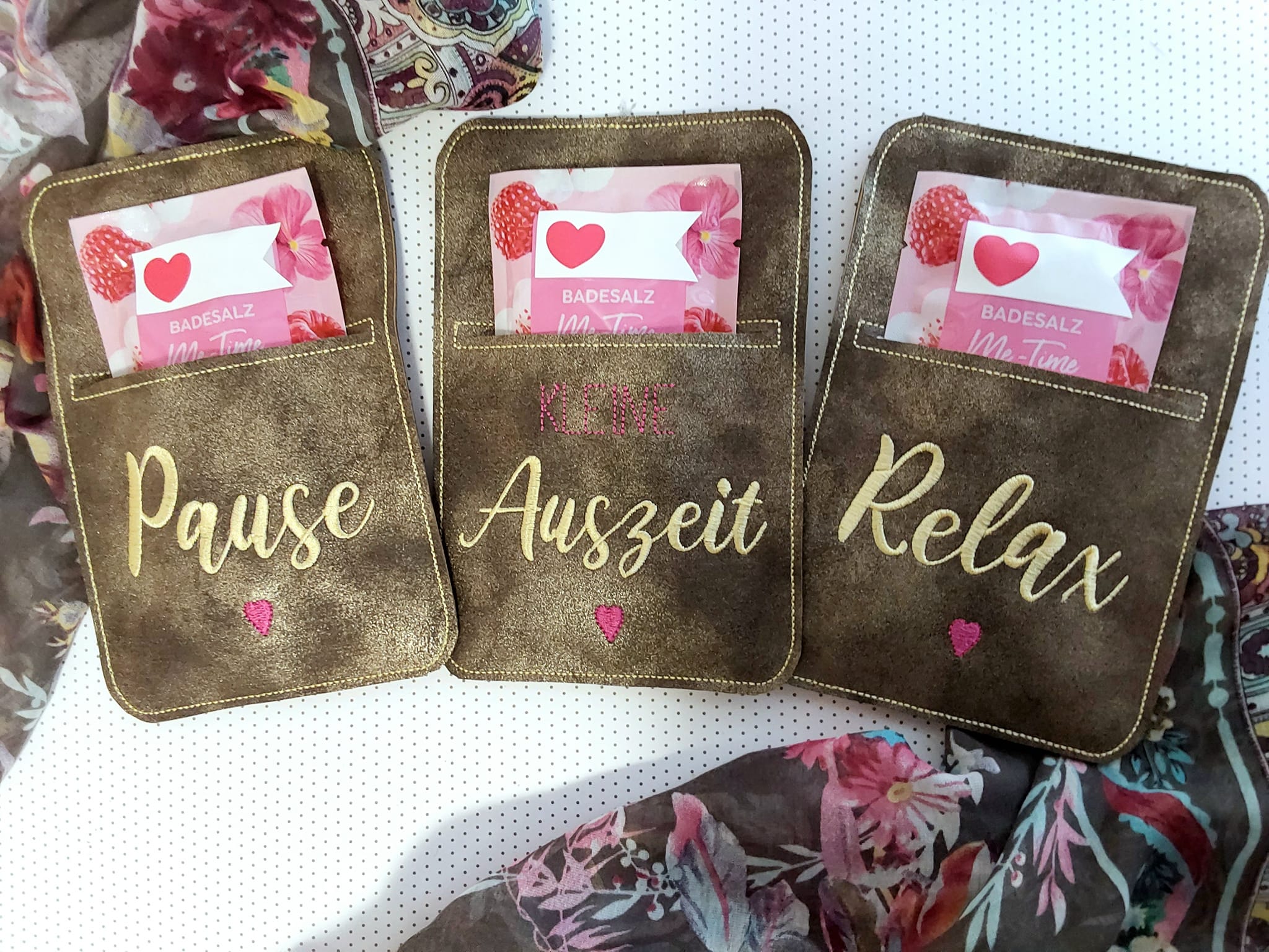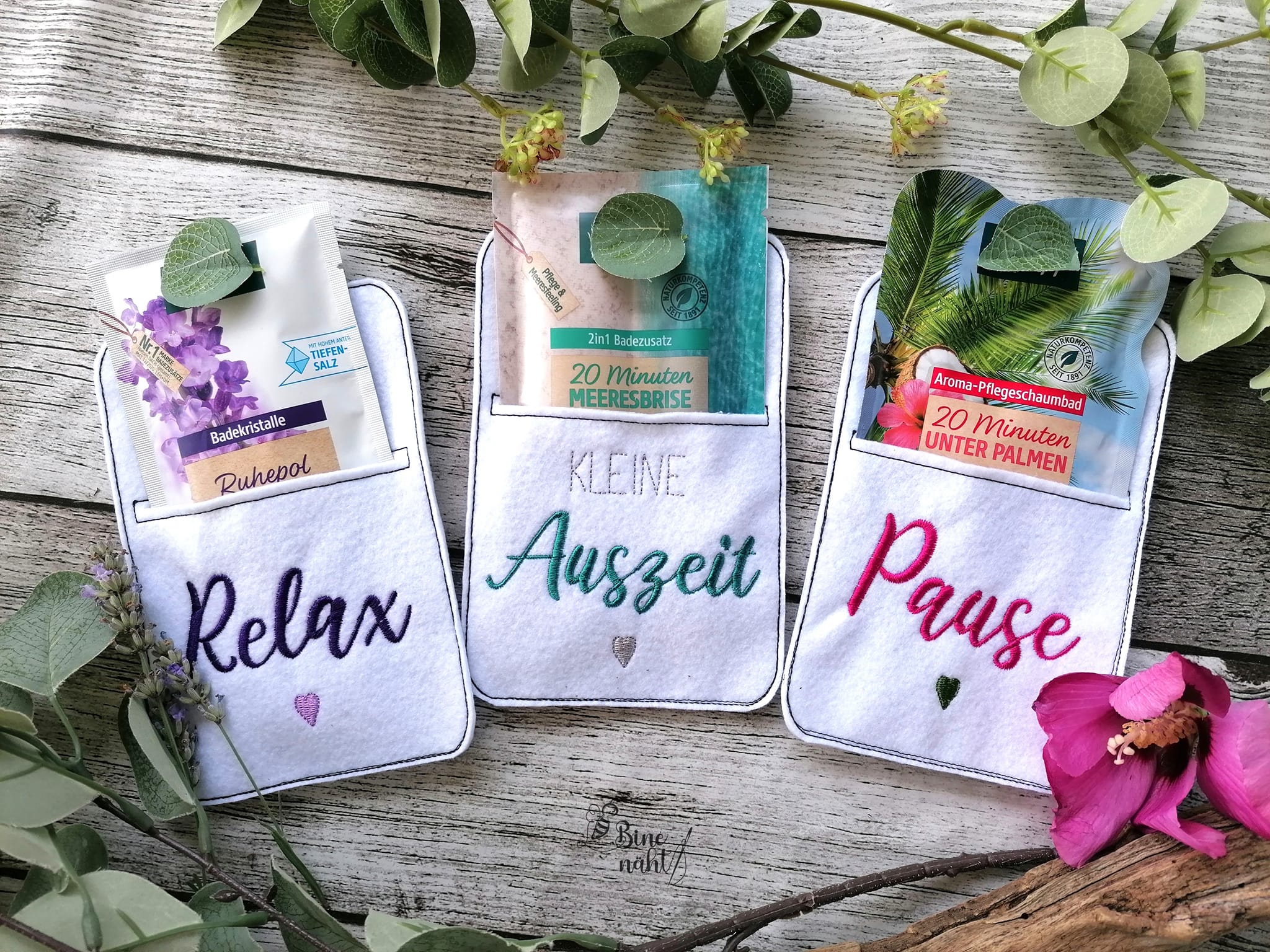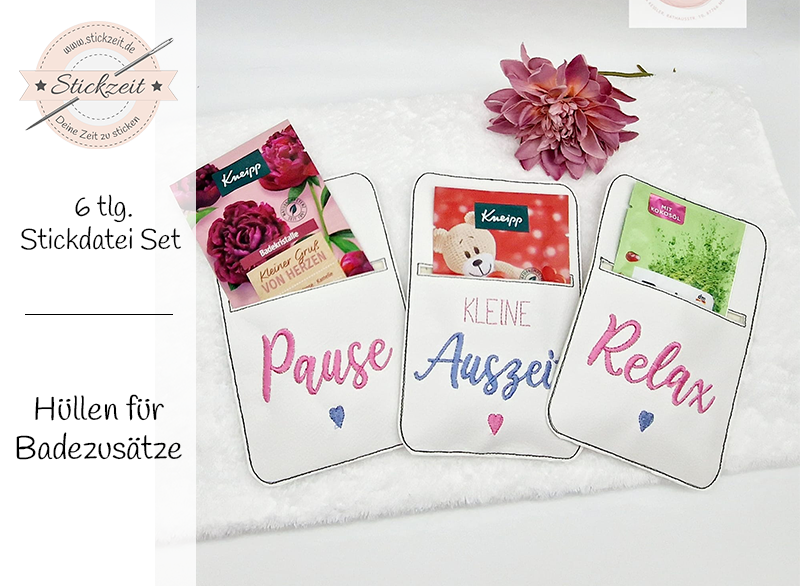 6 teiliges Stickdatei Set für ITH-Hüllen für Badezusätze und einzelnen Schriftzügen für den 10x10 und 13x18 Rahmen.