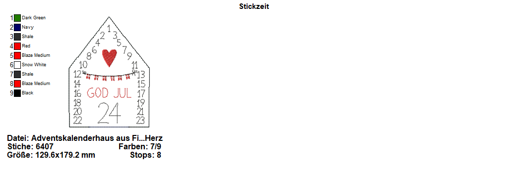 ITH-Stickdatei für den 13x18 Rahmen - Adventskalenderhaus aus Filz God Jul. Weihnachtliches Design mit Herzmotiv und skandinavischem „God Jul“-Look.