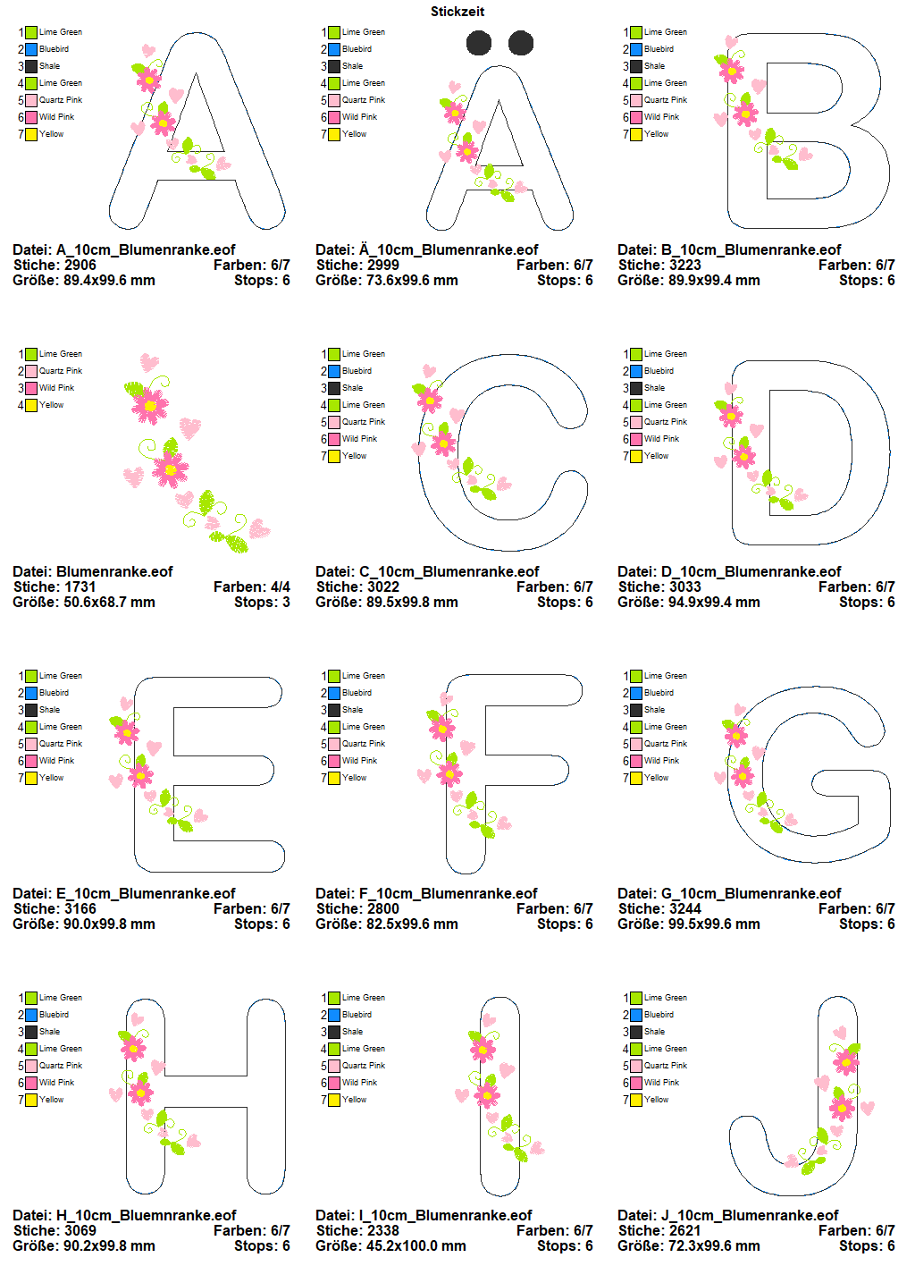 Das doodle Stickdatei Set - Alphabet Blumenranke - gibt es in den Größen 10 cm und 14 cm zu je 30 Dateien sowie mit allen 60 Dateien als Spar Set. Für zauberhafte individuelle Geschenke!
