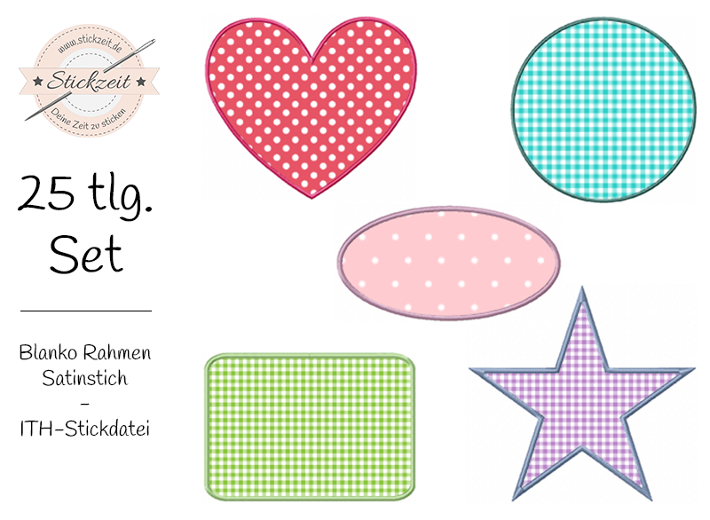 25 teiliges Satinstich Stickdatei Set - Blanko Rahmen - ab dem 10x10 Rahmen. 5 verschiedene Rahmen in je drei Größen zum Verzieren von hochflorigen Stoffen, wie Handtücher, Fleece, ect...