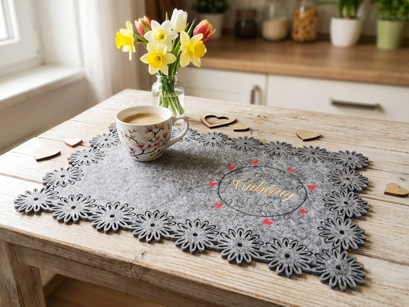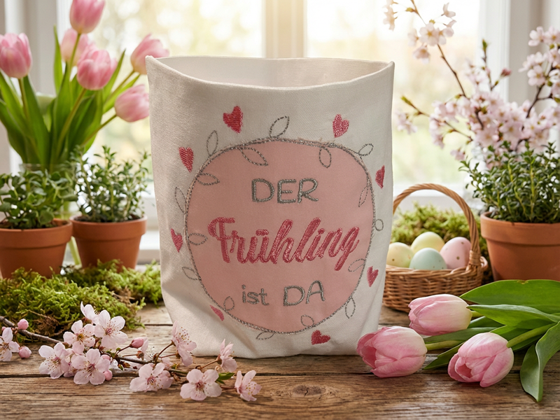 Mit diesem frühlingshaften Stickdatei-Set gestaltest du im Handumdrehen dekorative Motive mit dem Spruch „Der Frühling ist da“ und passender Ranke für dein nächstes Stickprojekt. Perfekt für saisonale Deko oder liebevolle Geschenkideen.