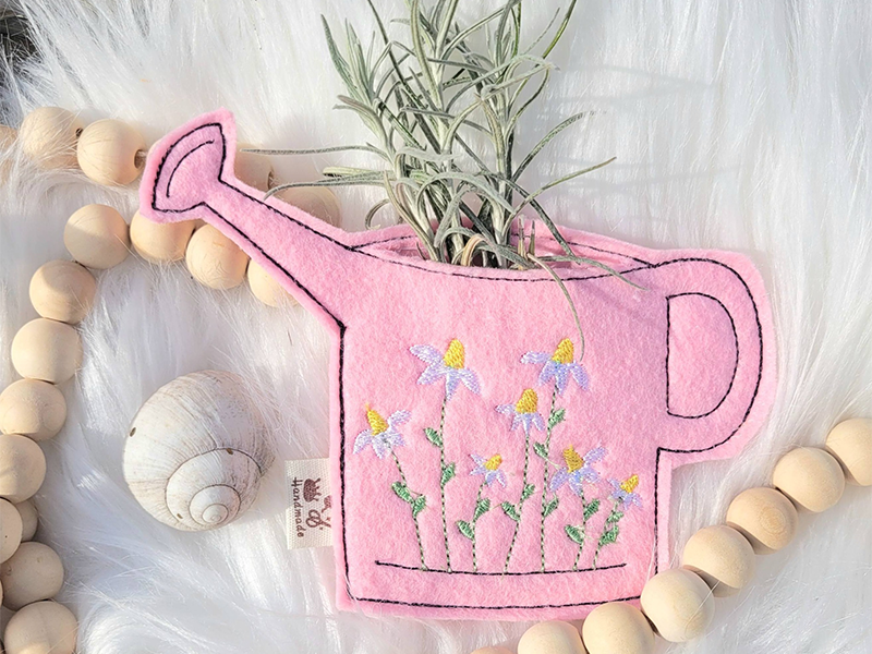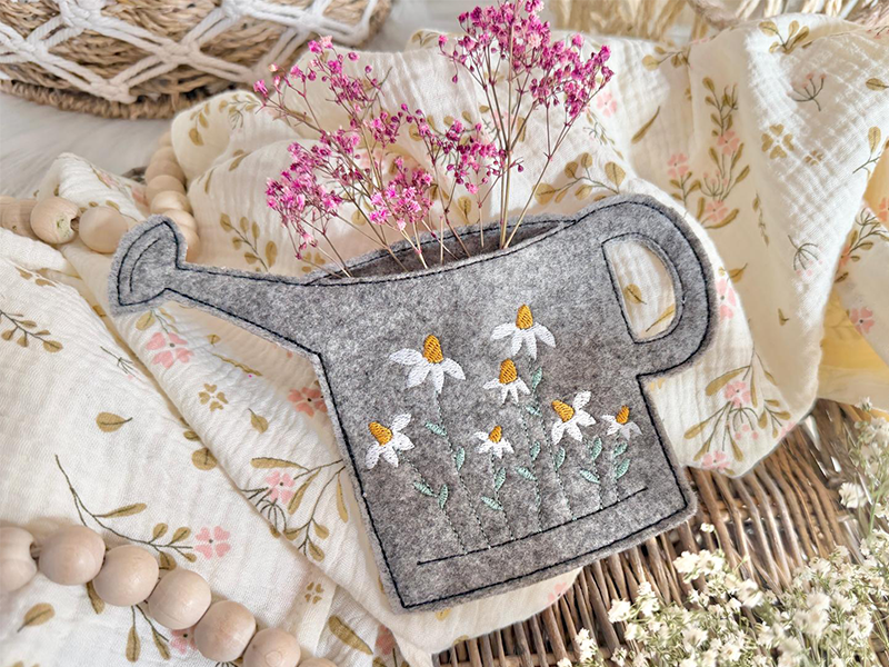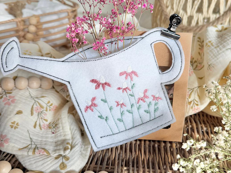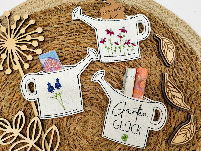 Mit diesem liebevoll gestalteten ITH-Stickdatei-Set entstehen im Handumdrehen dekorative kleine Gießkannen, die sich perfekt als Geldgeschenk, Gutscheinhalter oder kleine Überraschung eignen. Die Motive werden komplett im Rahmen (In-the-Hoop) gestickt und anschließend nur noch minimal fertiggestellt.