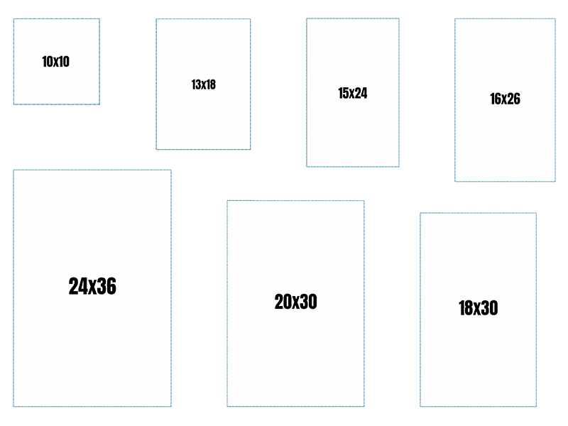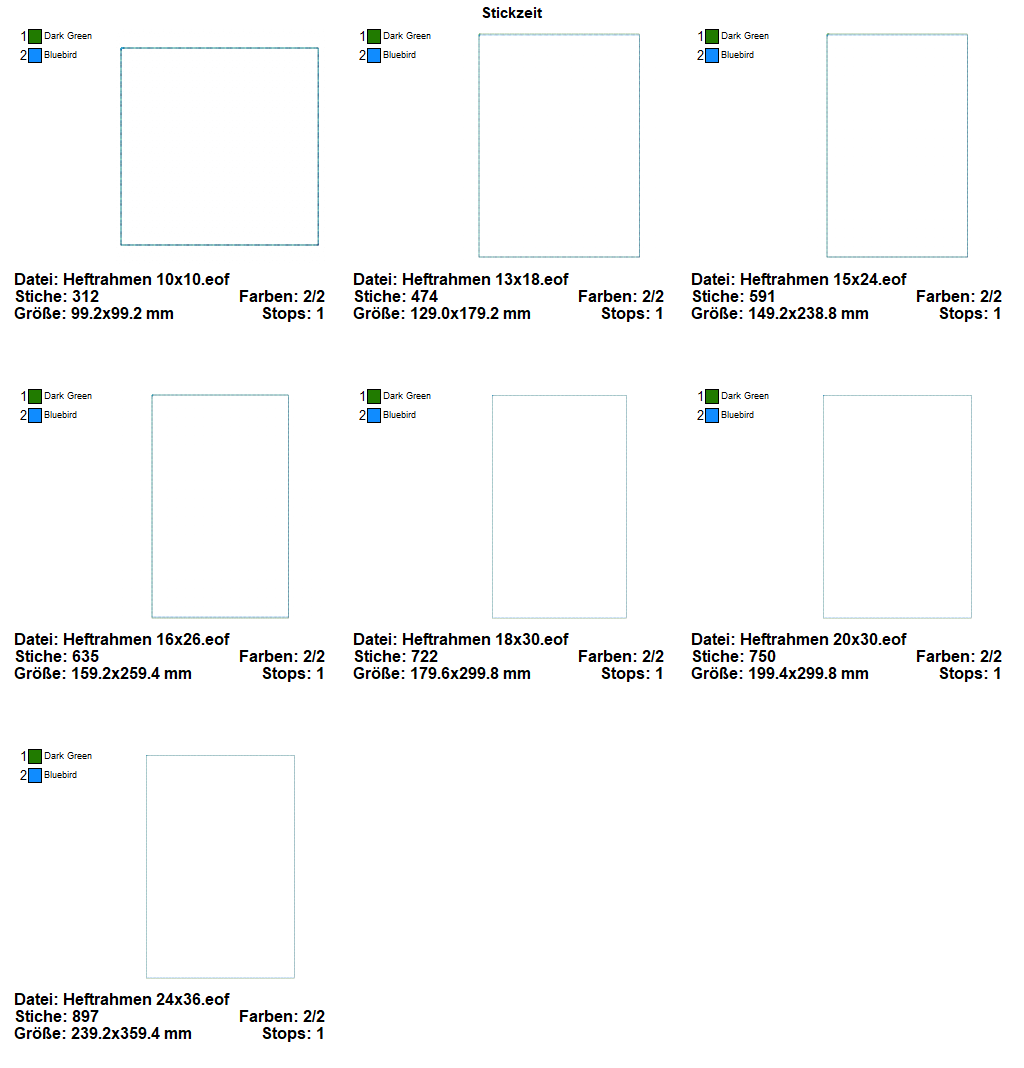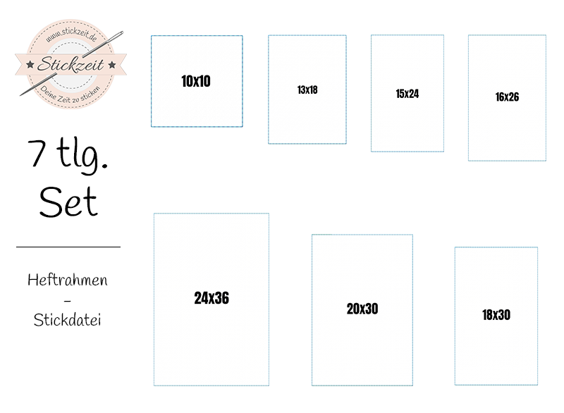 7 teiliges Stickdatei - Heftrahmen - ab dem 10x10 bis zum 24x36 Rahmen. Ideal zum fixieren von Stoffen vor dem Sticken. Verringert das verziehen gerade bei Vollstickmustern.