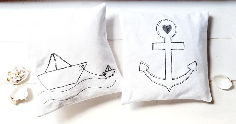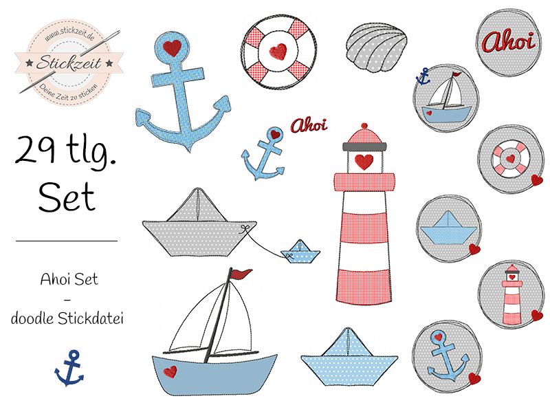 29 teiliges doodle Stickdatei Set - Ahoi. Zauberhafte doodle Dateien, wie Anker, Leuchtturm, Segelboot und Papierschiff für den maritimen Look.
