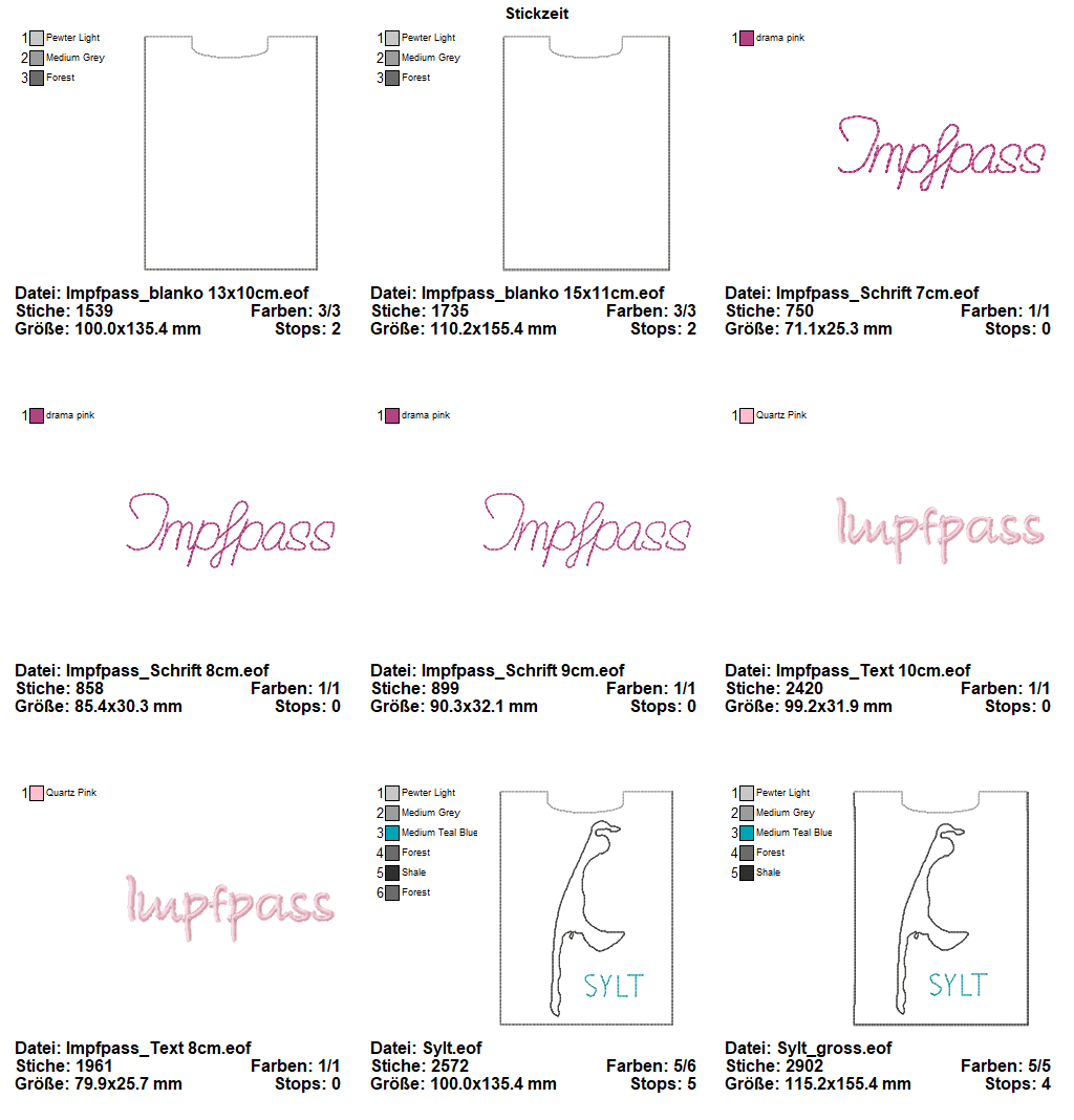 9 teiliges ITH-Stickdatei Set - Impfpasshülle Sylt - für den 13x18 Rahmen.