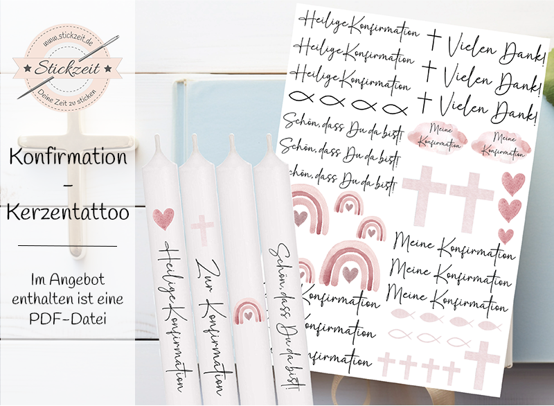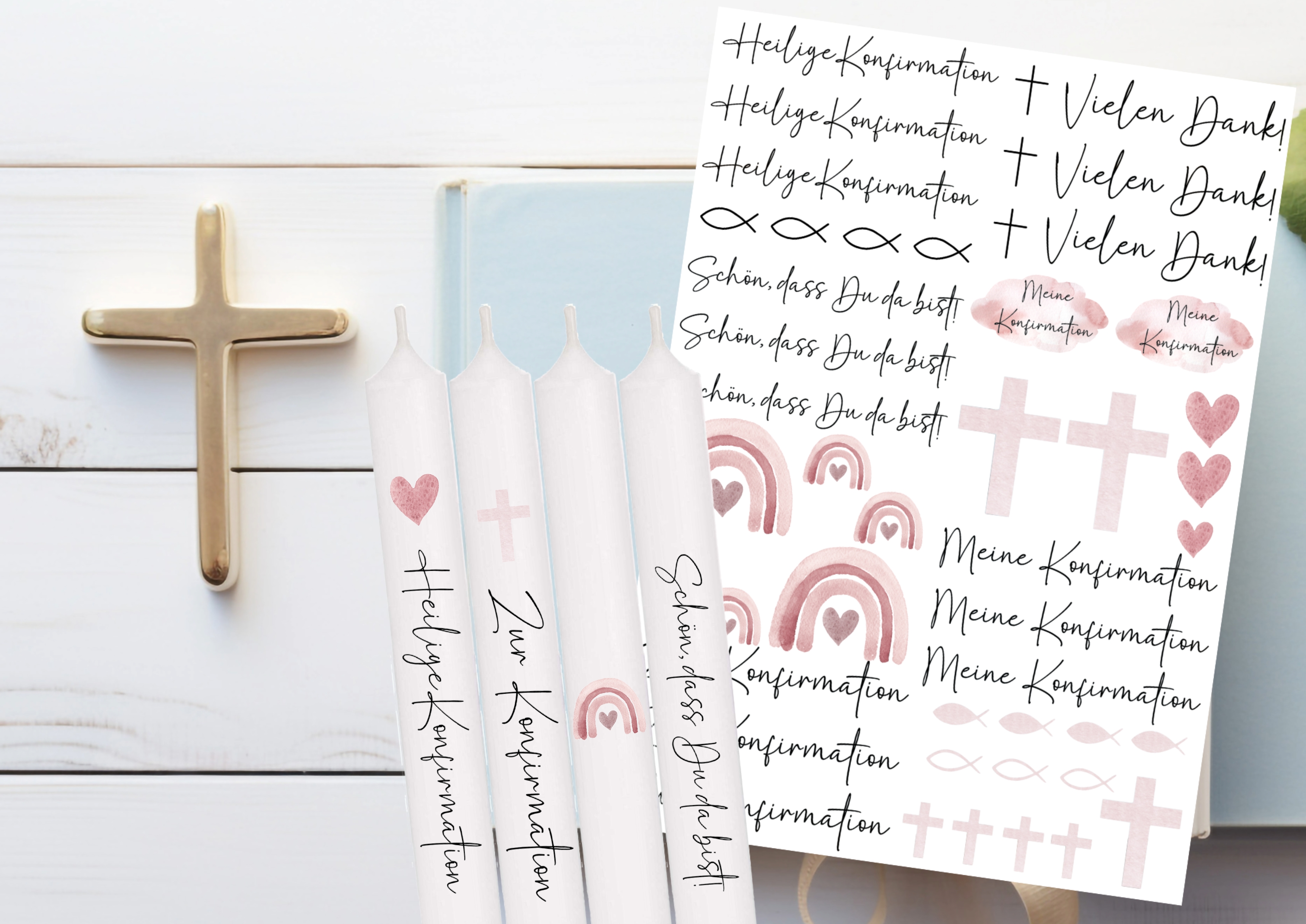 DIN A4 PDF-Vorlage für Kerzentattoos auf Wasserschiebefolie - Konfirmation rosa.