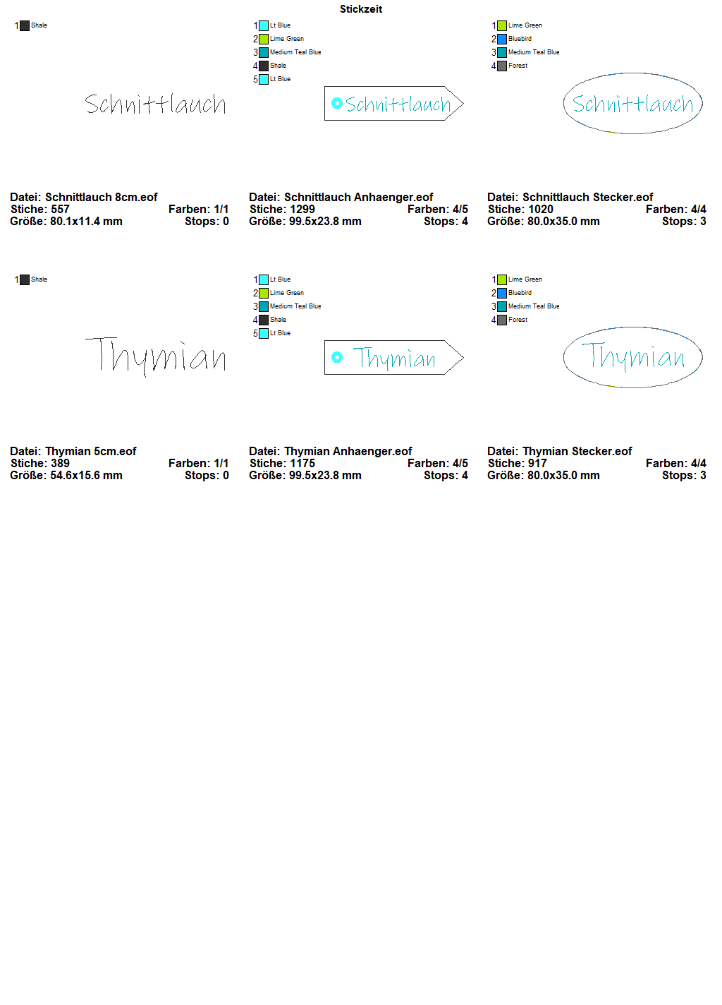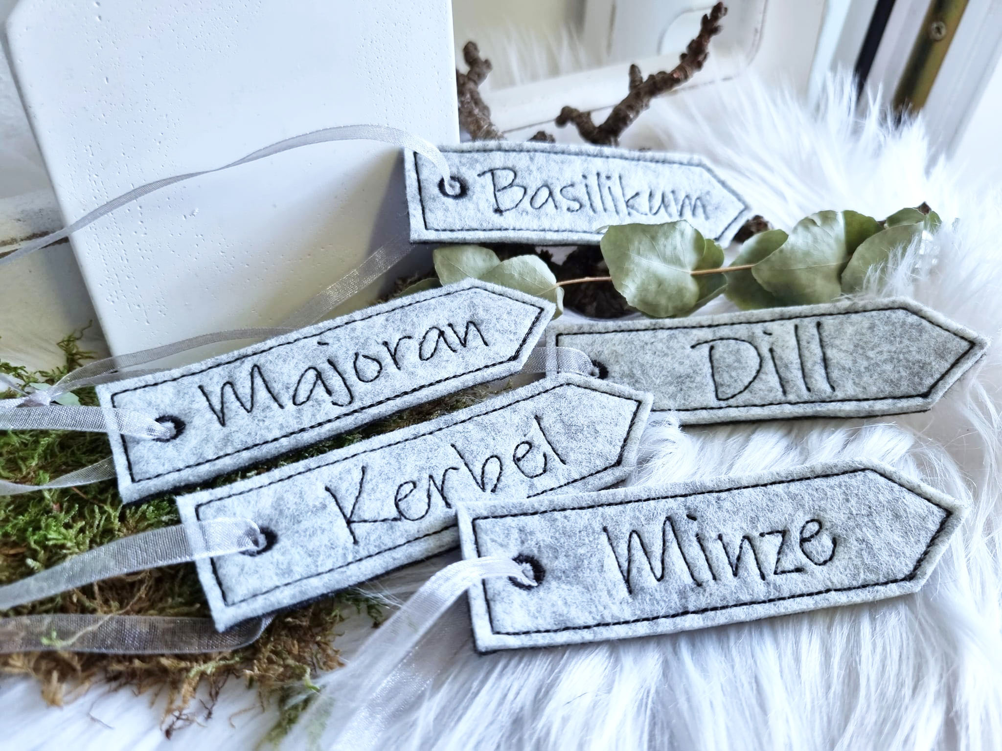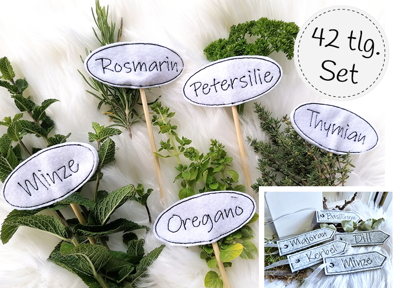42 teiliges Kräuterschilder-ITH-Stickdatei Mega Set! Im Set sind Kräuternamen, Kräuterstecker / Anhänger. Für die Dateien benötigst Du den 10x10. Für das schnelle sticken habe ich noch verschiedene Mehrfachbögen für den 13x18 und 18x30 Rahmen hinzugefügt. Also lasst die Kräuter sprießen!