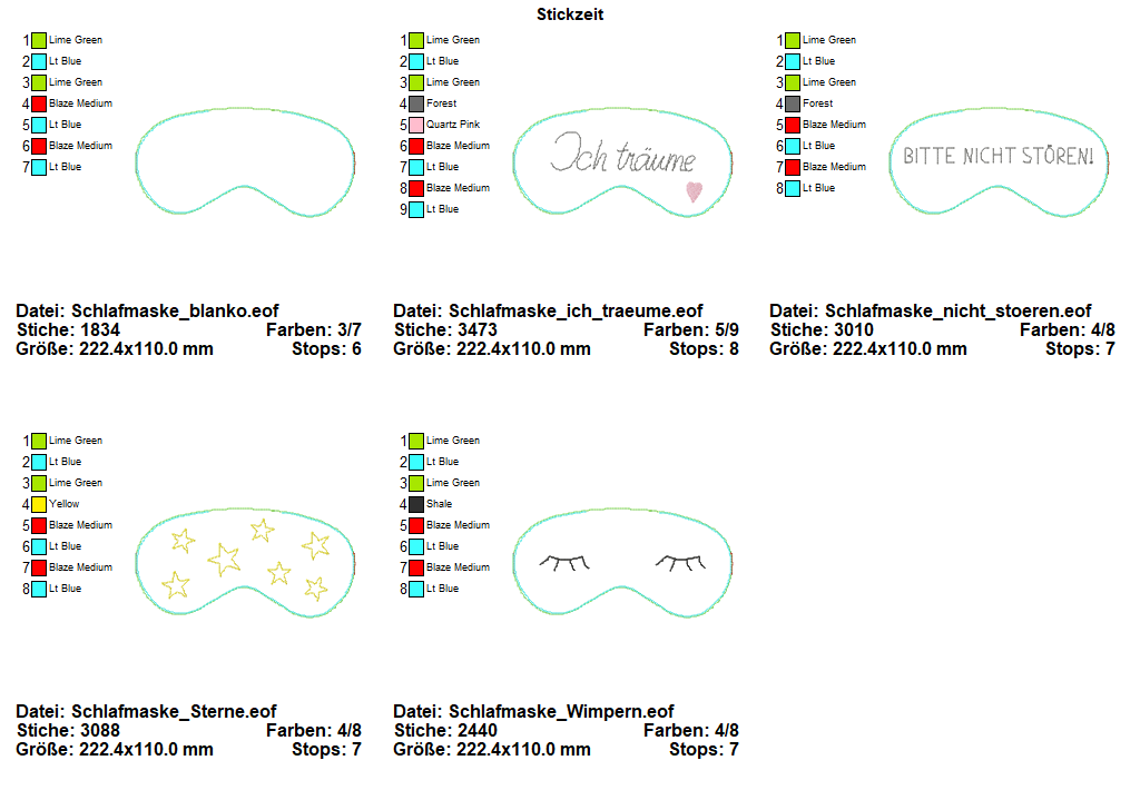 5 teiliges ITH-Schlafmasken Set ab dem 15x24 Rahmen zu sticken.