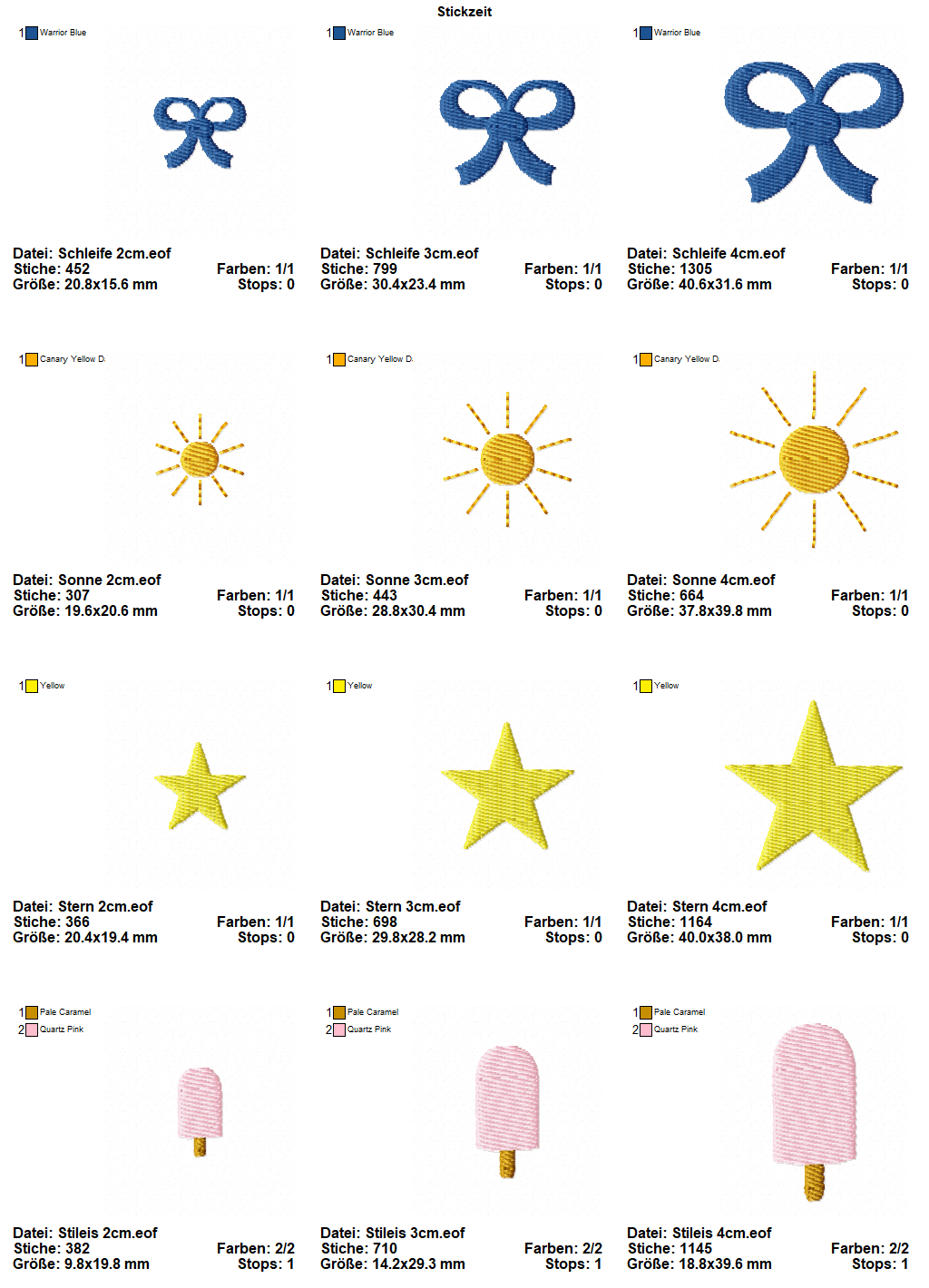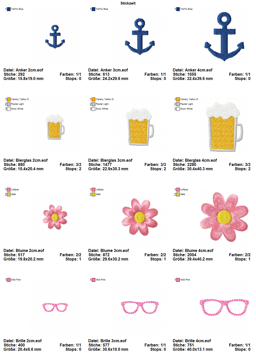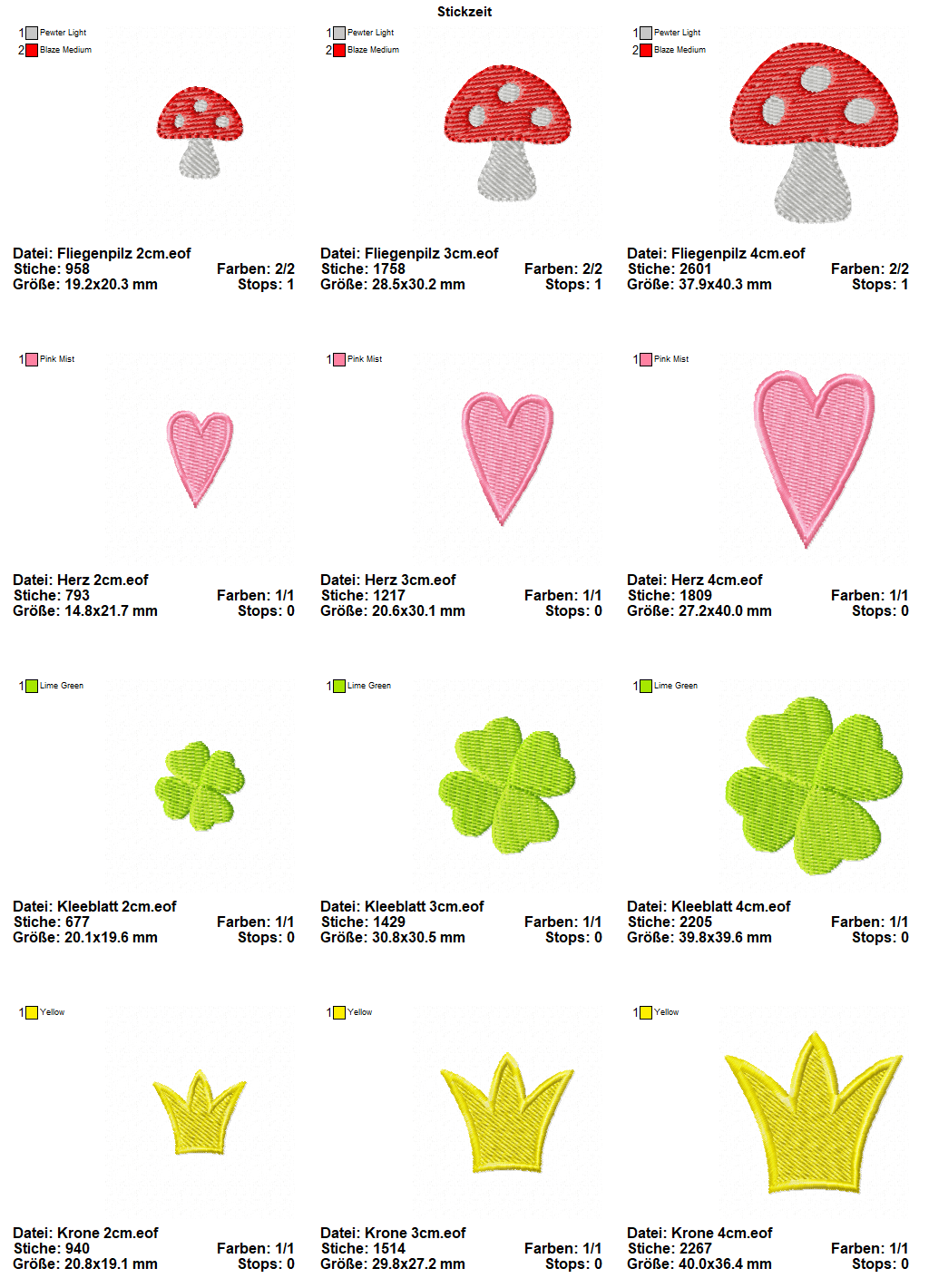 39 teiliges Vollstick Stickdatei Set - Mini Mix 1 - von Stickzeit. 13 verschiedene Desings in den Größen 2 cm, 3 cm und 4 cm.