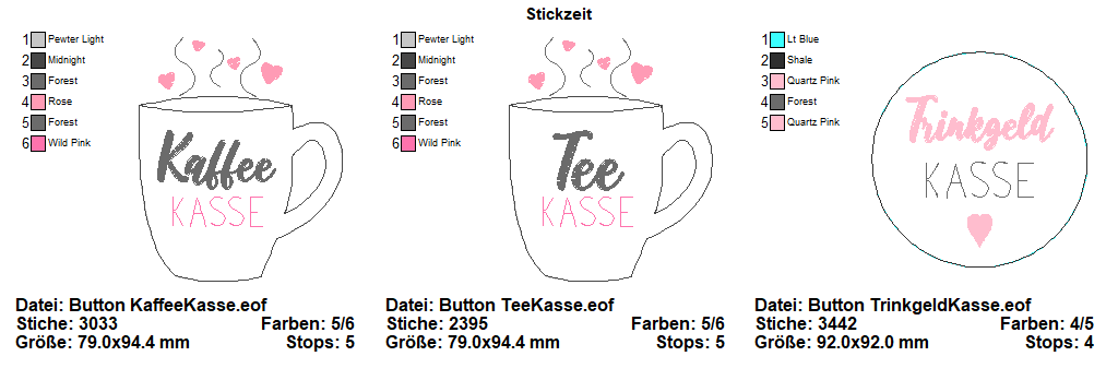 Folgende Stickformate werden in der ZIP-Datei angeboten: PEC - PES - XXX - JEF - JEF+ - SEW - EXP - VIP - VP3 - DST - HUS.