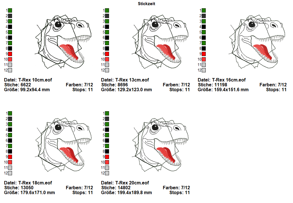 5 teiliges doodle Stickdatei Set - T-Rex Dinosaurier - für den 10x10 bis 20x30 Rahmen. Ideal zum Verschönern von Schultüten oder Kleidungsstücken.