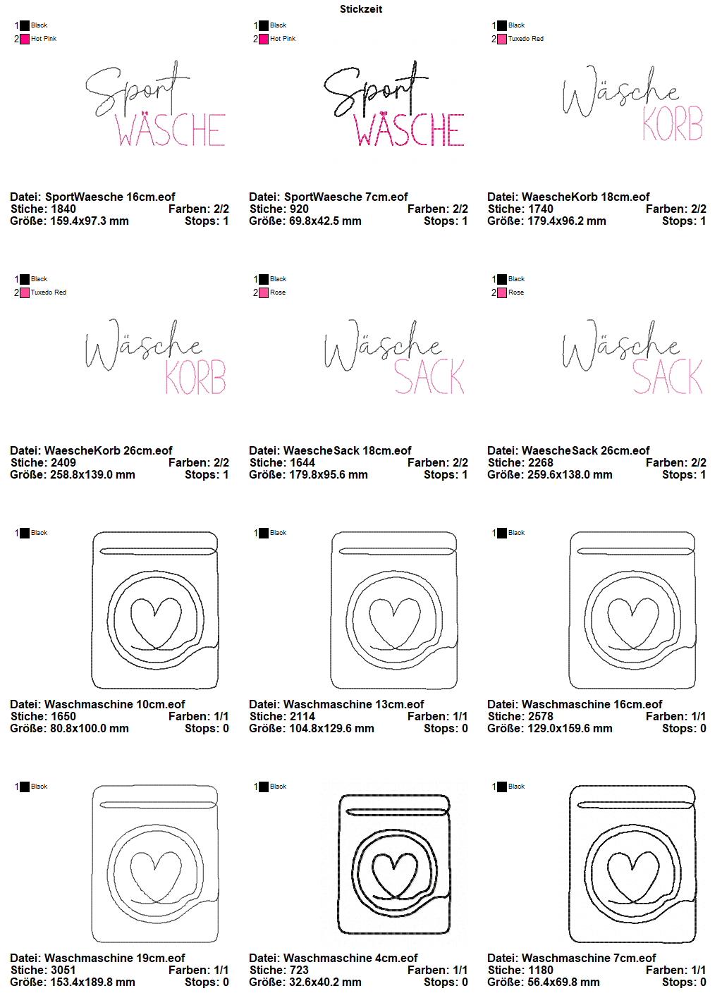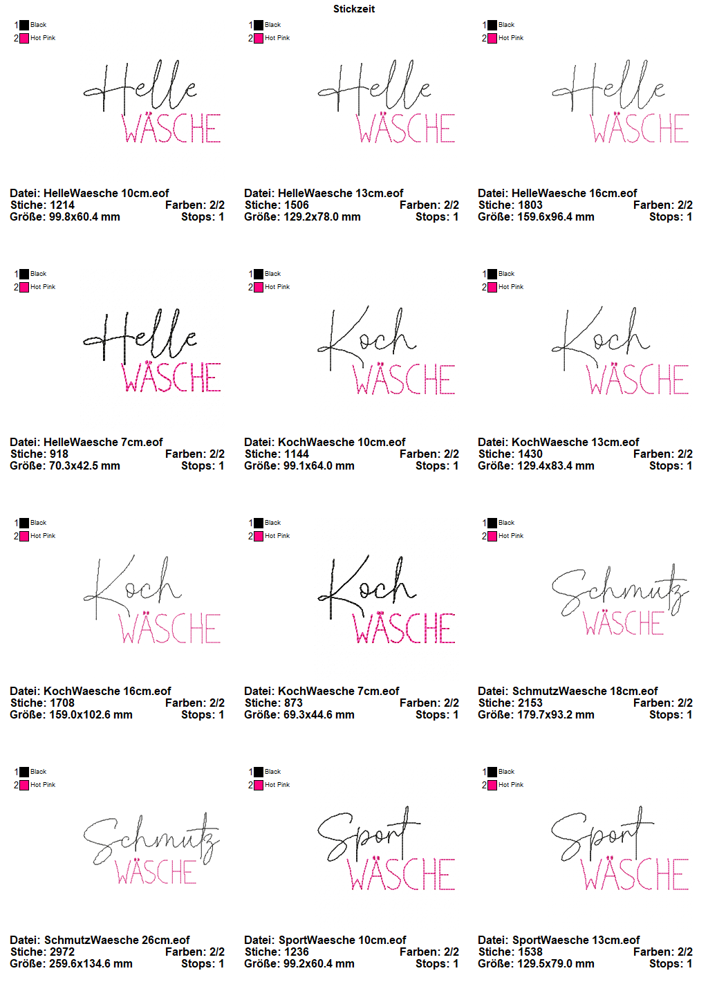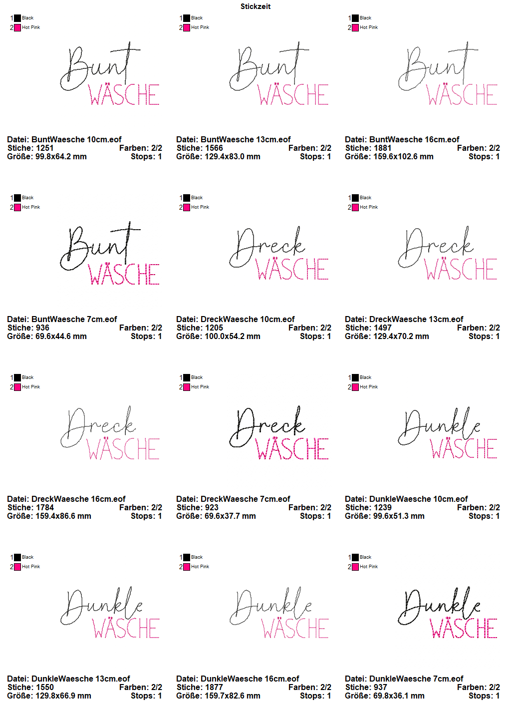 Folgende Stickformate werden in der ZIP-Datei angeboten: PEC - PES - XXX - JEF - JEF+ - SEW - EXP - VIP - VP3 - DST - HUS.
